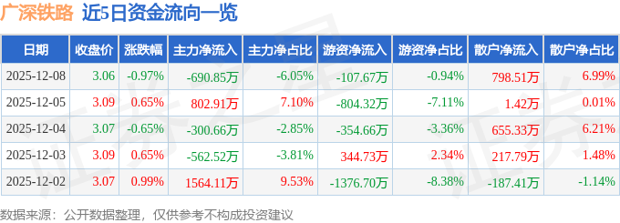 证券之星消息,截至2025年12月8日收盘,广深铁路(601333)报收于3.06元,下跌0.97%,换手率0.66%,成交量37.2万手,成交额1.14亿元。