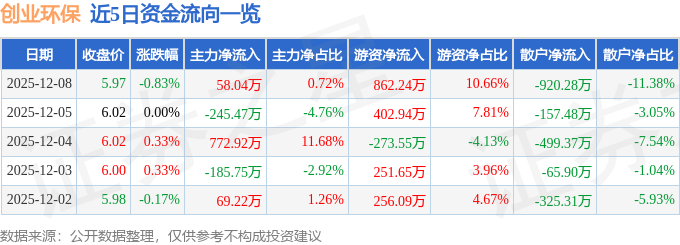 证券之星消息,截至2025年12月8日收盘,创业环保(600874)报收于5.97元,下跌0.83%,换手率1.1%,成交量13.51万手,成交额8089.05万元。