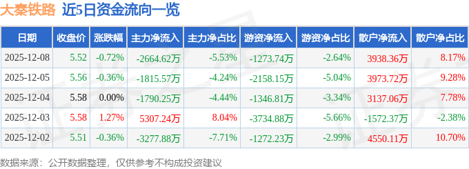 证券之星消息,截至2025年12月8日收盘,大秦铁路(601006)报收于5.52元,下跌0.72%,换手率0.43%,成交量87.13万手,成交额4.82亿元。