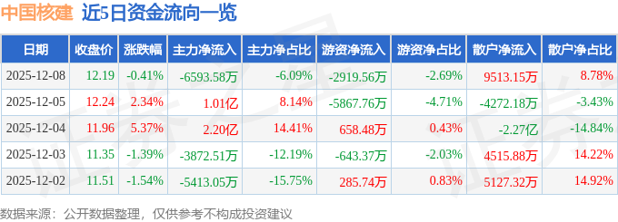 证券之星消息,截至2025年12月8日收盘,中国核建(601611)报收于12.19元,下跌0.41%,换手率2.92%,成交量88.14万手,成交额10.84亿元。