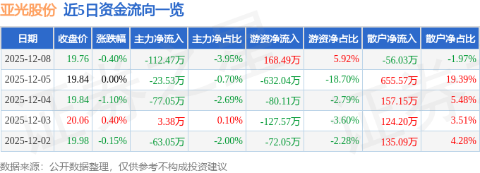 证券之星消息,截至2025年12月8日收盘,亚光股份(603282)报收于19.76元,下跌0.4%,换手率2.23%,成交量1.43万手,成交额2846.65万元。