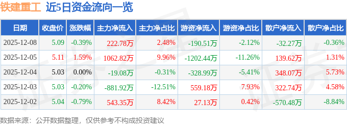 证券之星消息,截至2025年12月8日收盘,铁建重工(688425)报收于5.09元,下跌0.39%,换手率0.33%,成交量17.59万手,成交额8975.29万元。