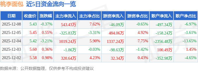 12月8日的资金流向数据方面,主力资金净流入543.43万元,占总成交额7.62%,游资资金净流出46.09万元,占总成交额0.65%,散户资金净流出497.34万元,占总成交额6.97%。