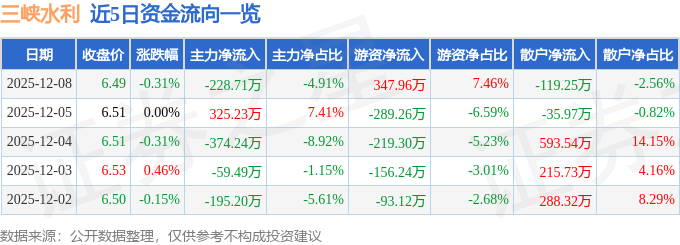 证券之星消息,截至2025年12月8日收盘,三峡水利(600116)报收于6.49元,下跌0.31%,换手率0.38%,成交量7.17万手,成交额4662.07万元。