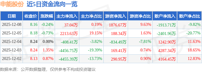 证券之星消息,截至2025年12月8日收盘,申能股份(600642)报收于8.16元,下跌0.24%,换手率0.49%,成交量23.97万手,成交额1.95亿元。