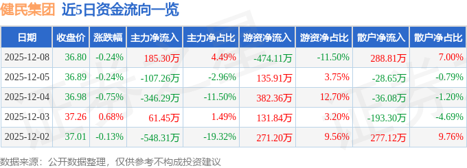 证券之星消息,截至2025年12月8日收盘,健民集团(600976)报收于36.8元,下跌0.24%,换手率0.73%,成交量1.12万手,成交额4123.04万元。