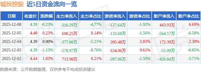 证券之星消息,截至2025年12月8日收盘,城投控股(600649)报收于4.39元,下跌0.23%,换手率0.6%,成交量15.04万手,成交额6636.21万元。