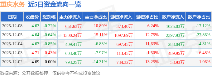 证券之星消息,截至2025年12月8日收盘,重庆水务(601158)报收于4.63元,下跌0.22%,换手率0.27%,成交量12.92万手,成交额5986.39万元。