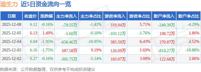 证券之星消息,截至2025年12月8日收盘,迪生力(603335)报收于6.12元,下跌0.16%,换手率2.14%,成交量9.16万手,成交额5601.45万元。