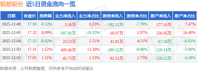 12月8日的资金流向数据方面,主力资金净流入5.36万元,占总成交额0.23%,游资资金净流出182.52万元,占总成交额7.7%,散户资金净流入177.16万元,占总成交额7.47%。