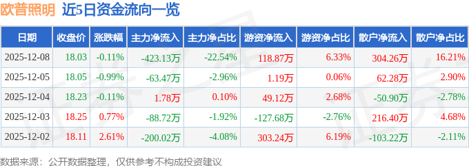 证券之星消息,截至2025年12月8日收盘,欧普照明(603515)报收于18.03元,下跌0.11%,换手率0.14%,成交量1.04万手,成交额1877.43万元。