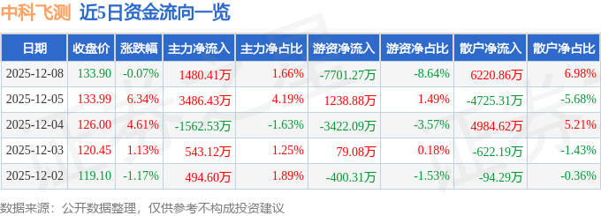 证券之星消息,截至2025年12月8日收盘,中科飞测(688361)报收于133.9元,下跌0.07%,换手率2.74%,成交量6.8万手,成交额8.92亿元。