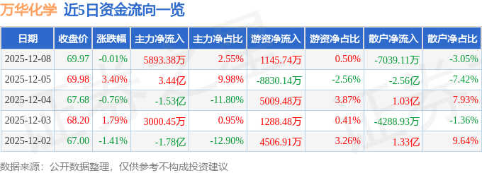 证券之星消息,截至2025年12月8日收盘,万华化学(600309)报收于69.97元,下跌0.01%,换手率1.05%,成交量32.98万手,成交额23.08亿元。