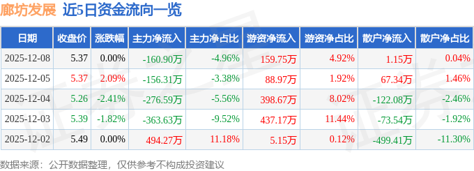 证券之星消息,截至2025年12月8日收盘,廊坊发展(600149)报收于5.37元,上涨0.0%,换手率1.59%,成交量6.03万手,成交额3245.04万元。