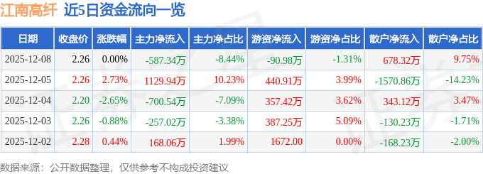 证券之星消息,截至2025年12月8日收盘,江南高纤(600527)报收于2.26元,上涨0.0%,换手率1.78%,成交量30.86万手,成交额6960.22万元。