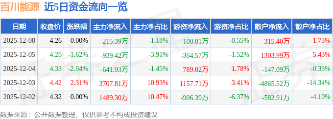 证券之星消息,截至2025年12月8日收盘,百川能源(600681)报收于4.26元,上涨0.0%,换手率3.2%,成交量42.84万手,成交额1.83亿元。