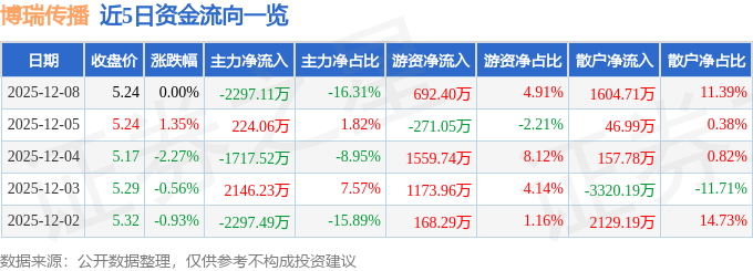 证券之星消息,截至2025年12月8日收盘,博瑞传播(600880)报收于5.24元,上涨0.0%,换手率2.44%,成交量26.69万手,成交额1.41亿元。