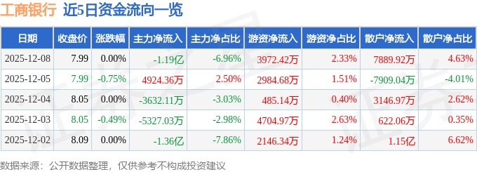 证券之星消息,截至2025年12月8日收盘,工商银行(601398)报收于7.99元,上涨0.0%,换手率0.08%,成交量213.08万手,成交额17.05亿元。
