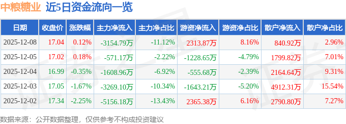 证券之星消息,截至2025年12月8日收盘,中粮糖业(600737)报收于17.04元,上涨0.12%,换手率0.78%,成交量16.63万手,成交额2.84亿元。