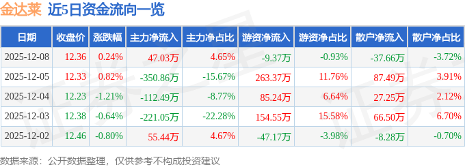 证券之星消息,截至2025年12月8日收盘,金达莱(688057)报收于12.36元,上涨0.24%,换手率0.3%,成交量8191.0手,成交额1012.35万元。