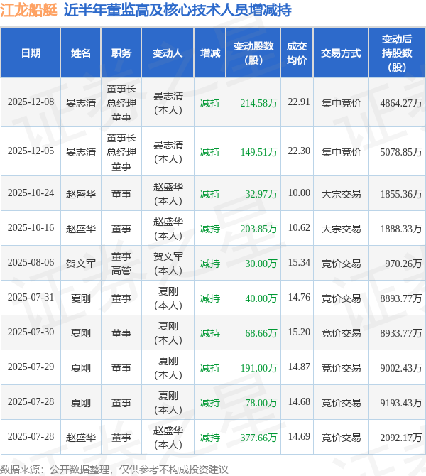 江龙船艇近半年内的董监高及核心技术人员增减持详情如下: