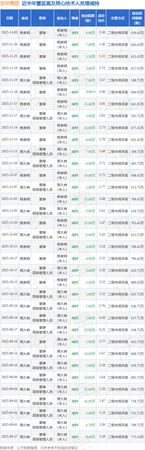 吉华集团近半年内的董监高及核心技术人员增减持详情如下: