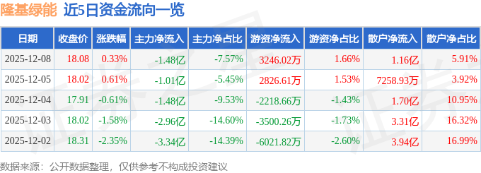 证券之星消息,截至2025年12月8日收盘,隆基绿能(601012)报收于18.08元,上涨0.33%,换手率1.43%,成交量108.32万手,成交额19.56亿元。