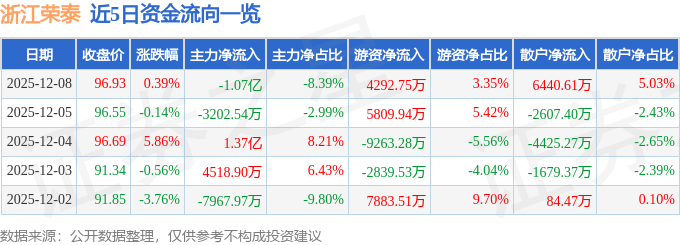 证券之星消息,截至2025年12月8日收盘,浙江荣泰(603119)报收于96.93元,上涨0.39%,换手率6.62%,成交量13.5万手,成交额12.8亿元。