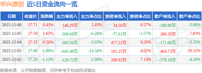 证券之星消息,截至2025年12月8日收盘,华兴源创(688001)报收于27.71元,上涨0.43%,换手率0.49%,成交量2.17万手,成交额6026.54万元。