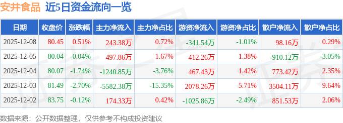 证券之星消息,截至2025年12月8日收盘,安井食品(603345)报收于80.45元,上涨0.51%,换手率1.45%,成交量4.25万手,成交额3.4亿元。