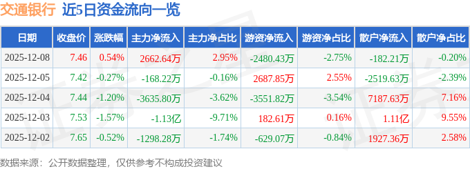 证券之星消息,截至2025年12月8日收盘,交通银行(601328)报收于7.46元,上涨0.54%,换手率0.46%,成交量120.83万手,成交额9.03亿元。
