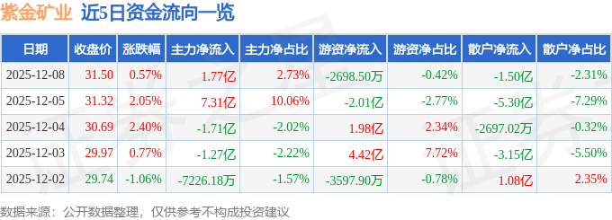 证券之星消息,截至2025年12月8日收盘,紫金矿业(601899)报收于31.5元,上涨0.57%,换手率1.0%,成交量206.8万手,成交额64.78亿元。