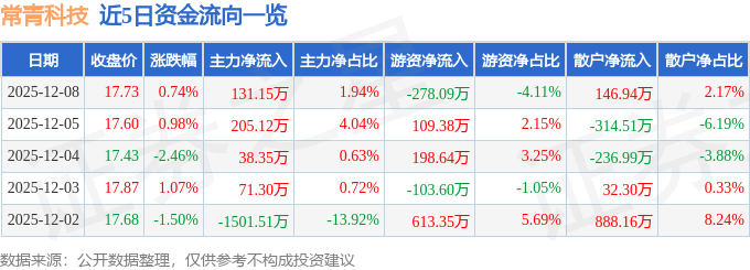 证券之星消息,截至2025年12月8日收盘,常青科技(603125)报收于17.73元,上涨0.74%,换手率3.79%,成交量3.83万手,成交额6773.63万元。