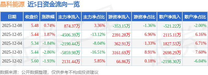 证券之星消息,截至2025年12月8日收盘,晶科能源(688223)报收于5.48元,上涨0.74%,换手率0.48%,成交量47.66万手,成交额2.6亿元。
