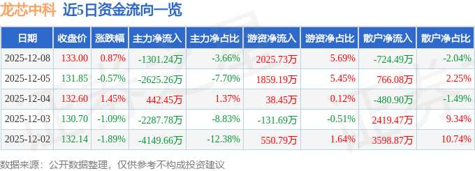 12月8日的资金流向数据方面,主力资金净流出1301.24万元,占总成交额3.66%,游资资金净流入2025.73万元,占总成交额5.69%,散户资金净流出724.49万元,占总成交额2.04%。