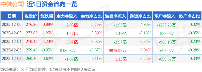 证券之星消息,截至2025年12月8日收盘,中微公司(688012)报收于276.26元,上涨0.89%,换手率2.3%,成交量14.4万手,成交额39.13亿元。