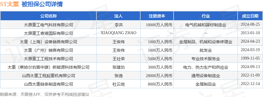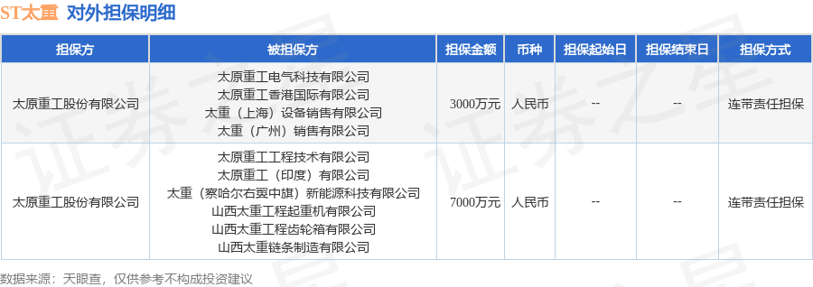 ST太重12月5日披露2笔对外担保,被担保公司10家。对外担保明细如下表: