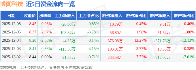证券之星消息,截至2025年12月8日收盘,博闻科技(600883)报收于8.45元,上涨0.96%,换手率1.21%,成交量2.85万手,成交额2397.97万元。