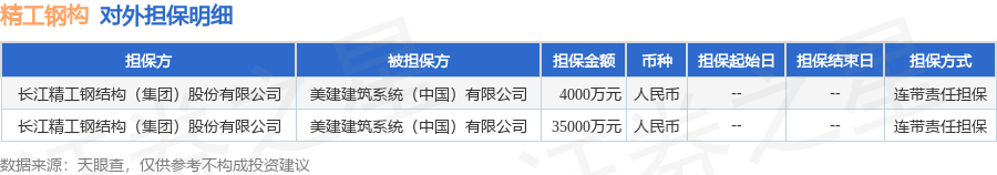 精工钢构12月5日披露2笔对外担保,被担保方为美建建筑系统(中国)有限公司。对外担保明细如下表: