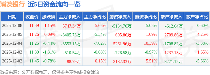 证券之星消息,截至2025年12月8日收盘,浦发银行(600000)报收于11.39元,上涨1.15%,换手率0.27%,成交量89.42万手,成交额10.17亿元。
