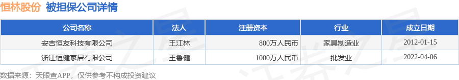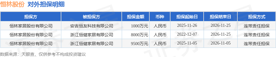 恒林股份12月5日披露3笔对外担保,被担保公司2家。对外担保明细如下表: