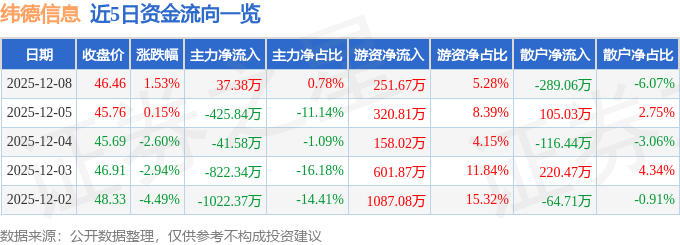 证券之星消息,截至2025年12月8日收盘,纬德信息(688171)报收于46.46元,上涨1.53%,换手率1.23%,成交量1.03万手,成交额4764.51万元。