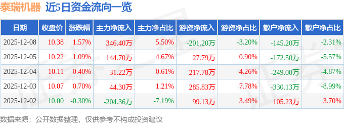 证券之星消息,截至2025年12月8日收盘,泰瑞机器(603289)报收于10.38元,上涨1.57%,换手率2.07%,成交量6.07万手,成交额6292.92万元。