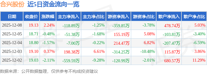 证券之星消息,截至2025年12月8日收盘,合兴股份(605005)报收于19.13元,上涨2.24%,换手率1.24%,成交量4.99万手,成交额9513.39万元。