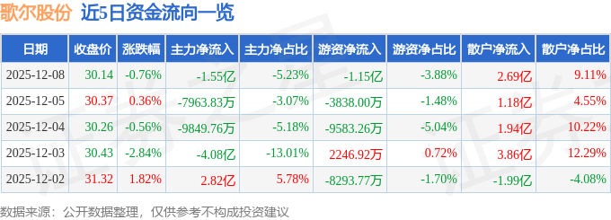 证券之星消息,截至2025年12月8日收盘,歌尔股份(002241)报收于30.14元,下跌0.76%,换手率3.14%,成交量98.64万手,成交额29.55亿元。