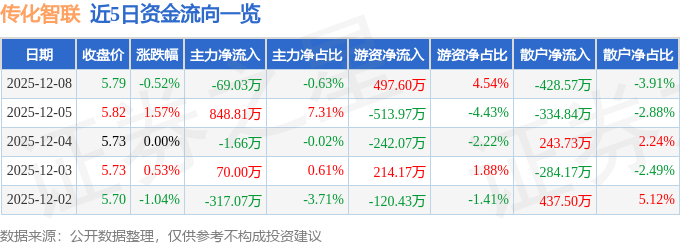 证券之星消息,截至2025年12月8日收盘,传化智联(002010)报收于5.79元,下跌0.52%,换手率0.68%,成交量18.86万手,成交额1.1亿元。