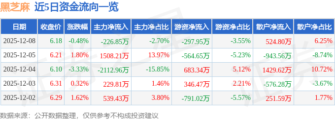 证券之星消息,截至2025年12月8日收盘,黑芝麻(000716)报收于6.18元,下跌0.48%,换手率1.84%,成交量13.59万手,成交额8402.86万元。
