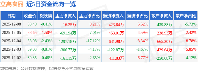 证券之星消息,截至2025年12月8日收盘,立高食品(300973)报收于38.49元,下跌0.41%,换手率1.71%,成交量2.0万手,成交额7675.06万元。