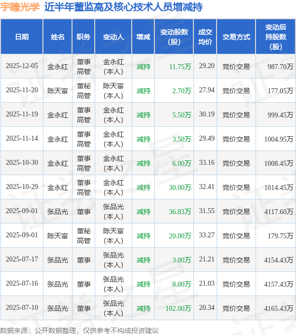 宇瞳光学近半年内的董监高及核心技术人员增减持详情如下: