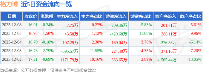证券之星消息,截至2025年12月8日收盘,格力博(301260)报收于16.91元,下跌0.24%,换手率1.04%,成交量2.12万手,成交额3594.08万元。